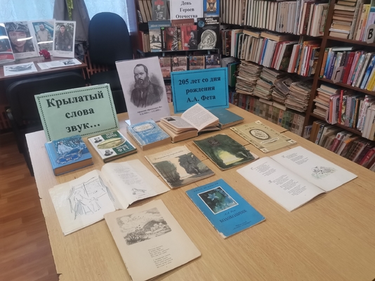 Наша библиотека предлагает вам вновь окунуться в высокий и романтический мир поэзии А. Фета. Для посетителей библиотеки оформлена выставка литературы «Крылатый слова звук…».»